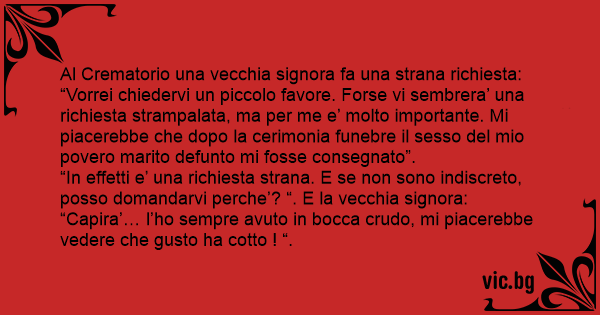 “In effetti e’ una richiesta strana. E se non sono indiscreto, posso domandarvi perche’? “. E la vecchia signora: