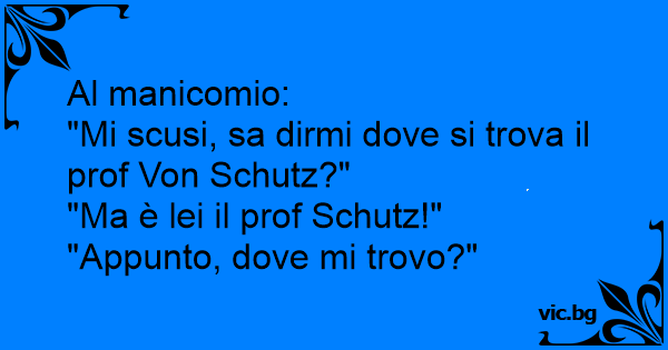 Al manicomio:<br />"Mi scusi, sa dirmi dove si trova il prof Von Schutz?"<br />"Ma è lei il prof Schutz!"<br />"Appunto, dove mi trovo?"