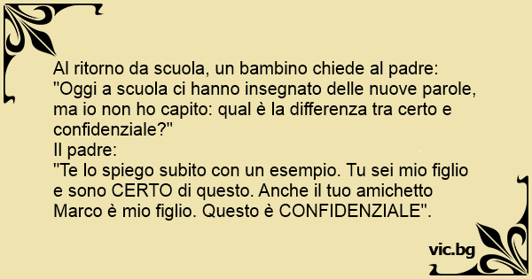 Un ragazzino chiede al padre: - 'Qual'è la differenza tra certo e confidenziale?' Il padre: - 'Tu sei mio figlio. Sono certo di questo. Il tuo amico qui sopra è anche lui mio figlio. Questo è...