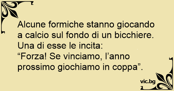 Alcune formiche stanno giocando a calcio sul fondo di un bicchiere. Una di esse le incita: