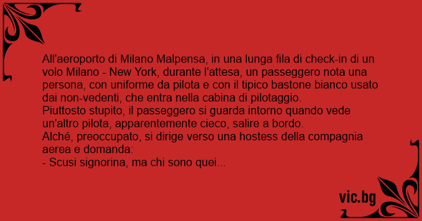 La hostess lo tranquillizza assicurandogli che, seppure ciechi, si tratta dei due più grandi piloti italiani che esistono, e che соn le moderne tecnologie a disposizione, anche un cieco può pilotare un aereo.