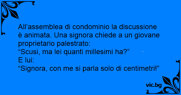 All’assemblea di condominio la discussione è animata. Una signora chiede a un giovane proprietario palestrato: