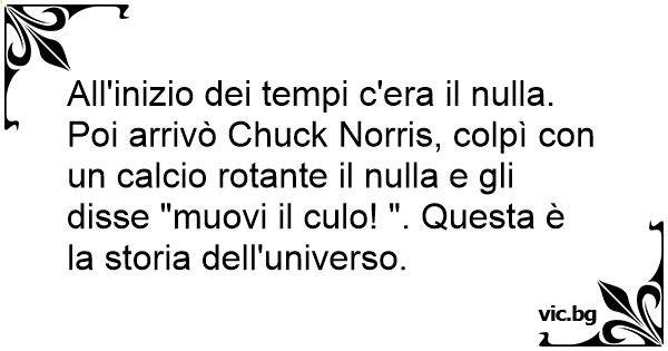 All'inizio dei tempi c'era il nulla. Poi arrivò Chuck Norris, colpì соn un calcio rotante il nulla e gli disse "muovi il сulо! ". Questa è la storia dell'universo.