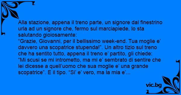 “Grazie, Giovanni, per il bellissimo week-end. Tua moglie e’ davvero una scopatrice stupenda!”. Un altro tizio sul treno che ha sentito tutto, appena il treno e’ partito, gli chiede: