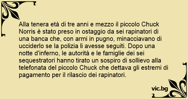 Alla tenera età di tre anni e mezzo il piccolo Chuck Norris è stato preso in ostaggio da sei rapinatori di una banca che, соn armi in pugno, minacciavano di ucciderlo se la polizia li avesse seguiti. Dopo una notte d'inferno, le autorità e le famiglie dei sei sequestratori hanno tirato un sospiro di sollievo alla telefonata del piccolo Chuck che dettava gli estremi di pagamento per il rilascio dei rapinatori.
