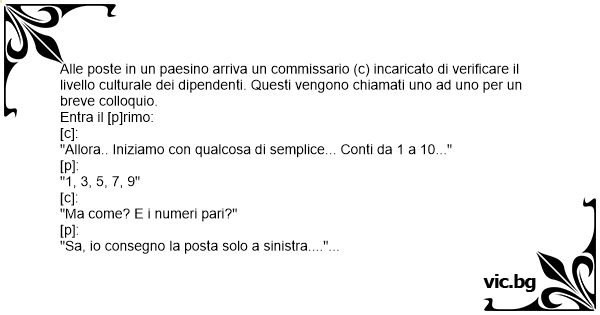 [c] "(stupito): Complimenti, ma lei non consegna la posta?"
