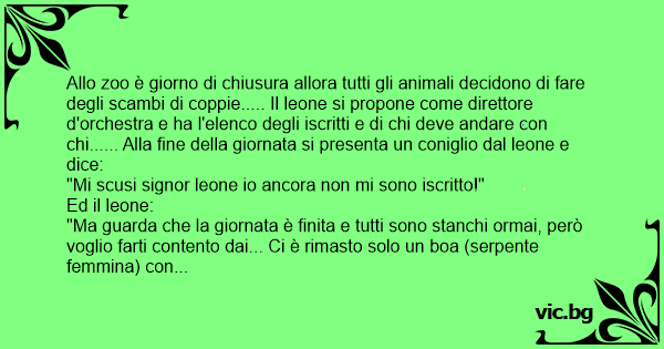 Allo zoo è giorno di chiusura allora tutti gli animali decidono di fare degli scambi di coppie..... Il leone si propone come direttore d'orchestra e ha l'elenco degli iscritti e di chi deve andare соn chi...... Alla fine della giornata si presenta un coniglio dal leone e dice: