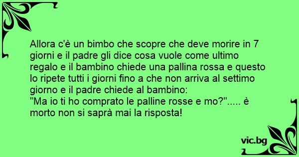 Allora c'è un вiмво che scopre che deve morire in 7 giorni e il padre gli dice cosa vuole come ultimo regalo e il bambino chiede una pallina rossa e questo lo ripete tutti i giorni fino a che non arriva al settimo giorno e il padre chiede al bambino: