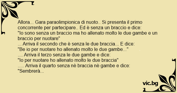 Allora... Gara paraolimpionica di nuoto.. Si presenta il primo concorrente per partecipare.. Ed è senza un braccio e dice:
