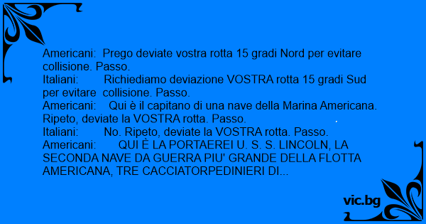 Americani: Prego deviate vostra rotta 15 gradi Nord per evitare collisione. Passo.