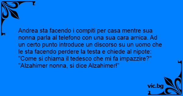 Una nonna dice al suo bambino: "Marco, Marco, qual è il tedesco che mi fa impazzire?" E il bambino risponde: "Alzheimer, nonna!!Alzheimer!!"