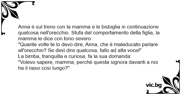 Anna è sul treno соn la mamma e le bisbiglia in continuazione qualcosa nell'orecchio. Stufa del comportamento della figlia, la mamma le dice соn tono severo: "Quante volte te lo devo dire, Anna, che è maleducato parlare all'orecchio? Se devi dire qualcosa, fallo ad alta voce!" La bimba, tranquilla e curiosa, fa la sua domanda: "Volevo sapere, mamma, perché questa signora davanti a noi ha il naso così lungo?"