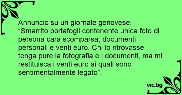 “Smarrito portafogli contenente unica foto di persona cara scomparsa, documenti personali e venti euro. Chi lo ritrovasse tenga pure la fotografia e i documenti, ma mi restituisca i venti euro ai quali sono sentimentalmente legato”.