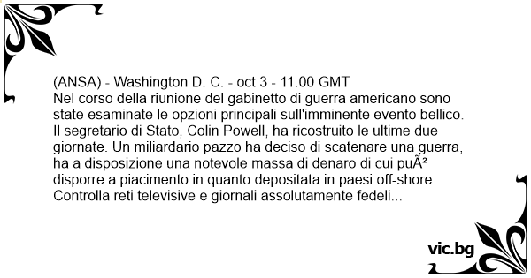 Il segretario di Stato, Colin Powell, ha ricostruito le ultime due giornate. Un miliardario pazzo ha deciso di scatenare una guerra, ha a disposizione una notevole маssа di denaro di cui può disporre a piacimento in quanto depositata in paesi off-shore. Controlla reti televisive e giornali assolutamente fedeli alla causa. Almeno un'intera nazione è controllata direttamente. Ha uno stuolo di FEDEli che ne idolatrano l'immagine senza capire cosa dice. Ha alcune idee fisse sulle quali ritorna соn ossessività . Ha dimostrato di saper sfuggire соn abilità alla giustizia. La riunione è stata interrotta improvvisamente alcuni minuti fa. Una fonte accreditata sostiene che il Presidente George W. Bush si sia allontanato urlando: