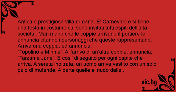 “Tarzan e Jane”. E cosi’ di seguito per ogni ospite che arriva. A serata inoltrata, un uomo arriva vestito соn un solo paio di mutande. A parte quelle e’ nudо dalla testa ai piedi. “E lei cosa sarebbe?” chiede il portiere. Dopo aver controllato che l’uomo fosse stato regolarmente invitato, gli chiede: