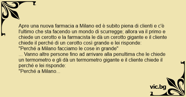 Apre una nuova farmacia a Milano ed è subito piena di clienti e c'è l'ultimo che sta facendo un mondo di scurregge; allora va il primo e chiede un cerotto e la farmacista le dà un cerotto gigante e il cliente chiede il perché di un cerotto così grande e lei risponde: