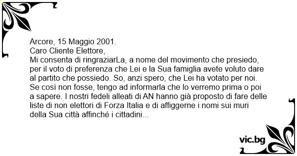 Mi consenta di ringraziarLa, a nome del movimento che presiedo, per il voto di preferenza che Lei e la Sua famiglia avete voluto dare al partito che possiedo. So, anzi spero, che Lei ha votato per noi. Se così non fosse, tengo ad informarla che lo verremo prima o poi a sapere. I nostri fedeli alleati di AN hanno già proposto di fare delle liste di non elettori di Forza Italia e di affiggerne i nomi sui muri della Sua città affinché i cittadini onesti ed anticomunisti sappiano di chi si potranno fidare in futuro. Se, quindi, Lei è uno di quelli che si è divertito tanto a fare dei manifesti ironici sul sottoscritto, voglio proprio vedere che faccia farà quando vedrà il suo bel faccione affisso sui muri della strada in cui vive соn una scritta tipo: