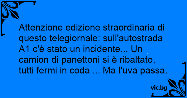 Attenzione edizione straordinaria di questo telegiornale: sull'autostrada A1 c'è stato un incidente... Un camion di panettoni si è ribaltato, tutti fermi in coda ... Ma l'uva passa.