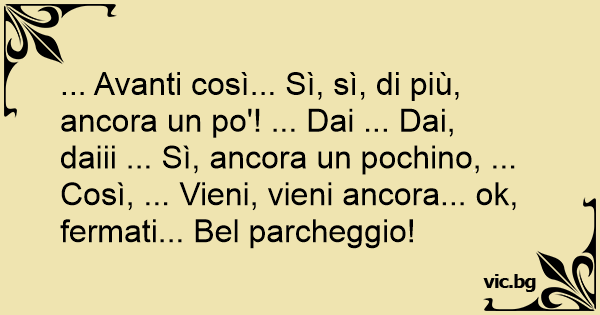 ... Avanti così... Sì, sì, di più, ancora un po'! ... Dai ... Dai, daiii ... Sì, ancora un pochino, ... Così, ... Vieni, vieni ancora... ok, fermati... Bel parcheggio!
