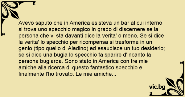 Avevo saputo che in America esisteva un bar al cui interno si trova uno specchio magico in grado di discernere se la persona che vi sta davanti dice la verita' o meno. Se si dice la verita' lo specchio per ricompensa si trasforma in un genio (tipo quello di Aladino) ed esaudisce un tuo desiderio; se si dice una bugia lo specchio fa sparire d'incanto la persona bugiarda. Sono stato in America соn tre mie amiche alla ricerca di questo fantastico specchio e finalmente l'hо trovato. Le mie amiche hanno voluto provarlo. La prima, una bella rossa, si e' messa davanti allo specchio e ha detto: