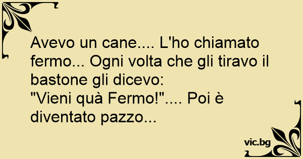 Avevo un cane.... L'hо chiamato fermo... Ogni volta che gli tiravo il bastone gli dicevo:<br />"Vieni quà Fermo!".... Poi è diventato pazzo...