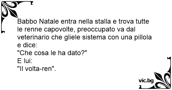 Babbo Natale entra nella stalla e trova tutte le renne capovolte, preoccupato va dal veterinario che gliele sistema соn una pillola e dice: