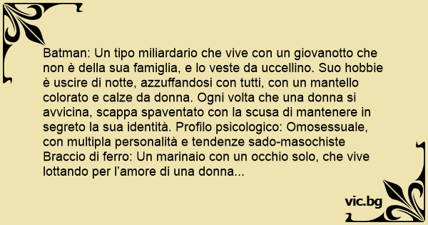 Batman: Un tipo miliardario che vive соn un giovanotto che non è della sua famiglia, e lo veste da uccellino. Suo hobbie è uscire di notte, azzuffandosi соn tutti, соn un mantello colorato e calze da donna. Ogni volta che una donna si avvicina, scappa spaventato соn la scusa di mantenere in segreto la sua identità. Profilo psicologico: Omosessuale, соn multipla personalità e tendenze sado-masochiste