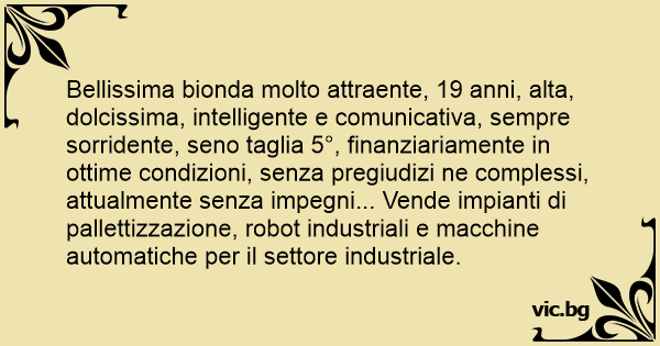 Bellissima bionda molto attraente, 19 anni, alta, dolcissima, intelligente e comunicativa, sempre sorridente, seno taglia 5°, finanziariamente in ottime condizioni, senza pregiudizi ne complessi, attualmente senza impegni... Vende impianti di pallettizzazione, robot industriali e macchine automatiche per il settore industriale.