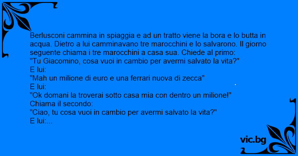 Berlusconi cammina in spiaggia e ad un tratto viene la bora e lo butta in acqua. Dietro a lui camminavano tre marocchini e lo salvarono. Il giorno seguente chiama i tre marocchini a casa sua. Chiede al primo: