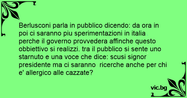 Berlusconi parla in pubblico dicendo: da ora in poi ci saranno piu sperimentazioni in italia perche il governo provvedera affinche questo obbiettivo si realizzi. tra il pubblico si sente uno starnuto e una voce che dice: scusi signor presidente ma ci saranno ricerche anche per chi e' allergico alle саzzате?
