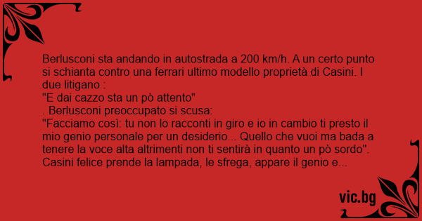 Berlusconi sta andando in autostrada a 200 km/h. A un certo punto si schianta contro una ferrari ultimo modello proprietà di Casini. I due litigano :