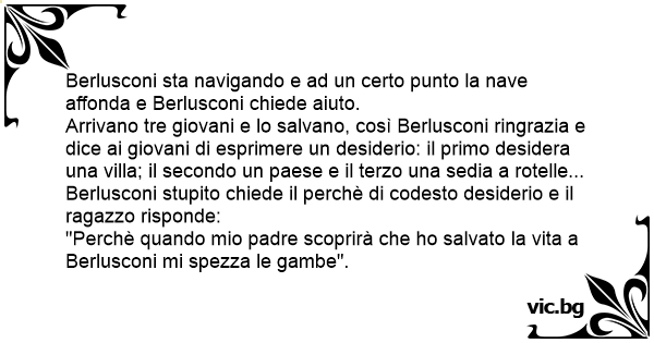 Arrivano tre giovani e lo salvano, così Berlusconi ringrazia e dice ai giovani di esprimere un desiderio: il primo desidera una villa; il secondo un paese e il terzo una sedia a rotelle... Berlusconi stupito chiede il perchè di codesto desiderio e il ragazzo risponde: