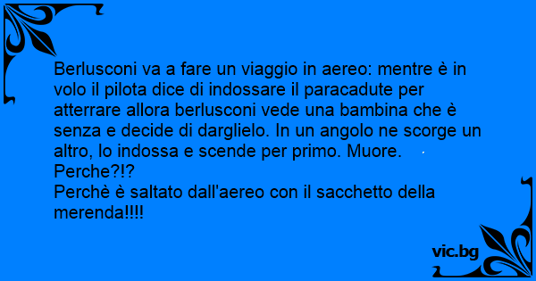 Berlusconi va a fare un viaggio in aereo: mentre è in volo il pilota dice di indossare il paracadute per atterrare allora berlusconi vede una bambina che è senza e decide di darglielo. In un angolo ne scorge un altro, lo indossa e scende per primo. Muore.