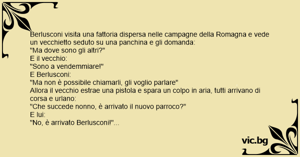 Berlusconi visita una fattoria dispersa nelle campagne della Romagna e vede un vecchietto seduto su una panchina e gli domanda: