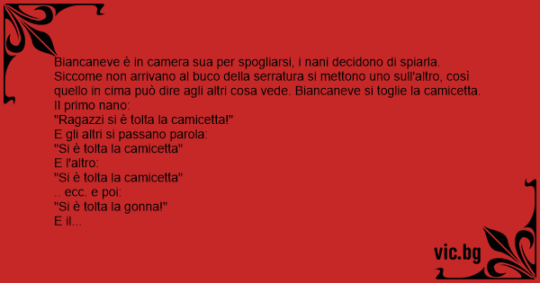 Biancaneve è in camera sua per spogliarsi, i nani decidono di spiarla. Siccome non arrivano al buco della serratura si mettono uno sull'altro, così quello in cima può dire agli altri cosa vede. Biancaneve si toglie la camicetta. Il primo nano: