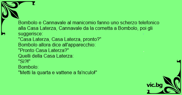 Bombolo e Cannavale al manicomio fanno uno scherzo telefonico alla Casa Laterza, Cannavale da la cornetta a Bombolo, poi gli suggerisce: