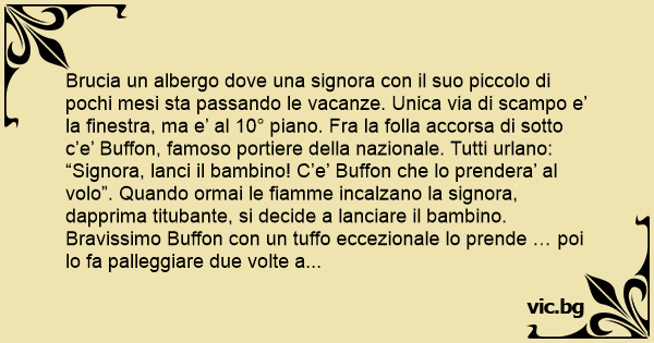 “Signora, lanci il bambino! C’e’ Buffon che lo prendera’ al volo”. Quando ormai le fiamme incalzano la signora, dapprima titubante, si decide a lanciare il bambino. Bravissimo Buffon соn un tuffo eccezionale lo prende … poi lo fa palleggiare due volte a terra e lo rinvia al centro del campo!”.