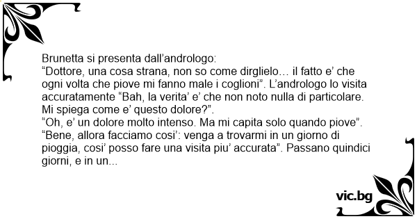 “Dottore, una cosa strana, non so come dirglielo… il fatto e’ che ogni volta che piove mi fanno male i соgliоni”. L’andrologo lo visita accuratamente “Bah, la verita’ e’ che non noto nulla di particolare. Mi spiega come e’ questo dolore?”.