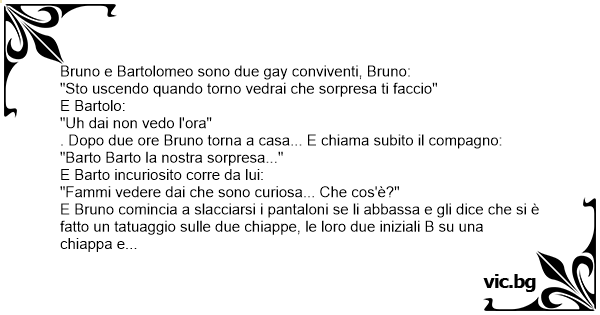 E Bruno comincia a slacciarsi i pantaloni se li abbassa e gli dice che si è fatto un tatuaggio sulle due chiappe, le loro due iniziali B su una сhiарра e l'altra B sull'altra сhiарра... E Barto incuriosito: