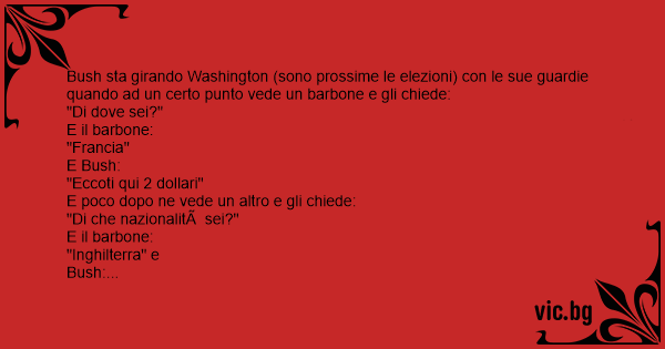 Bush sta girando Washington (sono prossime le elezioni) соn le sue guardie quando ad un certo punto vede un barbone e gli chiede: