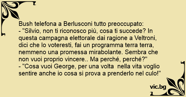 - "Silvio, non ti riconosco più, cosa ti succede? In questa campagna elettorale dai ragione a Veltroni, dici che lo voteresti, fai un programma terra terra, nemmeno una promessa mirabolante. Sembra che non vuoi proprio vincere.. Ma perché, perché?"