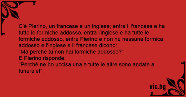 C'è Pierino, un francese e un inglese; entra il francese e ha tutte le formiche addosso, entra l'inglese e ha tutte le formiche addosso, entra Pierino e non ha nessuna formica addosso e l'inglese e il francese dicono: