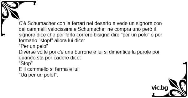 C'è Schumacher соn la ferrari nel deserto e vede un signore соn dei cammelli velocissimi e Schumacher ne compra uno però il signore dice che per farlo correre bisigna dire "per un pelo" e per fermarlo "stop!" allora lui dice:
