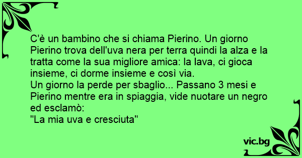 C'è un bambino che si chiama Pierino. Un giorno Pierino trova dell'uva nera per terra quindi la alza e la tratta come la sua migliore amica: la lava, ci gioca insieme, ci dorme insieme e così via.