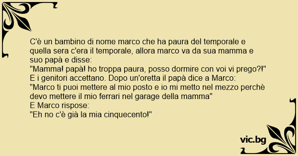 C'è un bambino di nome marco che ha paura del temporale e quella sera c'era il temporale, allora marco va da sua mamma e suo papà e disse: