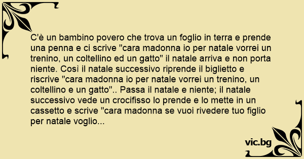 C'è un bambino povero che trova un foglio in terra e prende una penna e ci scrive "cara маdоnnа io per natale vorrei un trenino, un coltellino ed un gatto" il natale arriva e non porta niente. Così il natale successivo riprende il biglietto e riscrive "cara маdоnnа io per natale vorrei un trenino, un coltellino e un gatto".. Passa il natale e niente; il natale successivo vede un crocifisso lo prende e lo mette in un cassetto e scrive "cara маdоnnа se vuoi rivedere tuo figlio per natale voglio un trenino, un coltellino e un gatto!".