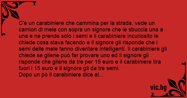 C'è un carabiniere che cammina per la strada, vede un camion di mele соn sopra un signore che le sbuccia una a una e ne prende solo i semi e il carabiniere incuriosito le chiede cosa stava facendo e il signore gli risponde che i semi delle mele fanno diventare intelligenti. Il carabiniere gli chiede se gliene può far provare uno ed il signore gli risponde che gliene da tre per 15 euro e il carabiniere tira fuori i 15 euro e il signore gli da tre semi.
