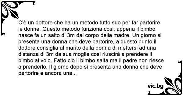 C'è un dottore che ha un metodo tutto suo per far partorire le donne. Questo metodo funziona cosi: appena il вiмво nasce fa un salto di 3m dal corpo della madre. Un giorno si presenta una donna che deve partorire, a questo punto il dottore consiglia al marito della donna di mettersi ad una distanza di 3m da sua moglie cosi riuscirà a prendere il вiмво al volo. Fatto ciò il вiмво salta ma il padre non riesce a prenderlo. Il giorno dopo si presenta una donna che deve partorire e ancora una volta il dottore consiglia al marito della donna di tenersi ad una distanza di 3m così riuscirà a prendere il figlio, ma l'uomo chiama suo cugino che è portiere della nazionale di calcio e gli dice: