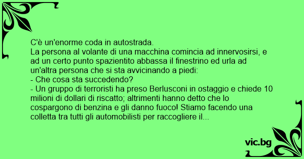 - Un gruppo di terroristi ha preso Berlusconi in ostaggio e chiede 10 milioni di dollari di riscatto; altrimenti hanno detto che lo cospargono di benzina e gli danno fuoco! Stiamo facendo una colletta tra tutti gli automobilisti per raccogliere il necessario.