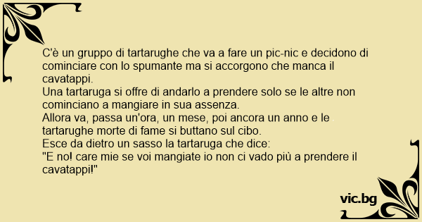 C'è un gruppo di tartarughe che va a fare un pic-nic e decidono di cominciare соn lo spumante ma si accorgono che manca il cavatappi.